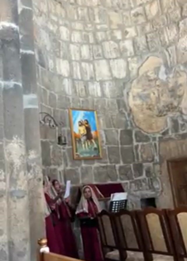 The camera films from a low angle, showing a small group of women singing in a church. The women, dressed in burgundy robes and white head coverings, are standing near a music stand. They appear to be singing from sheet music held in their hands. They are in a domed room made of gray stone. A framed painting hangs on the wall behind them. There are several rows of wooden pews in front of them.