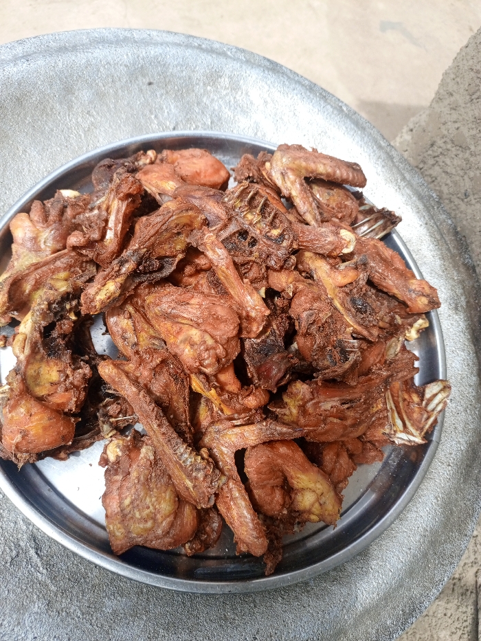 A round, silver-colored metal plate is depicted, filled to capacity with an assortment of deep-fried chicken pieces. The chicken pieces exhibit a dark brown, crispy exterior, indicating thorough frying, with some lighter brown and yellow-tinged areas visible on larger sections. Identifiable parts include wings, drumsticks, and fragmented bone structures. The metal plate rests on a larger, textured, silver-grey surface, possibly a metal platter or a rough concrete slab. A portion of a light-colored, rough-hewn stone or concrete structure is visible in the upper right background. No individuals or active interactions are present in the scene. The location is an unspecified outdoor or rustic setting in the city of Unknown, Unknown.