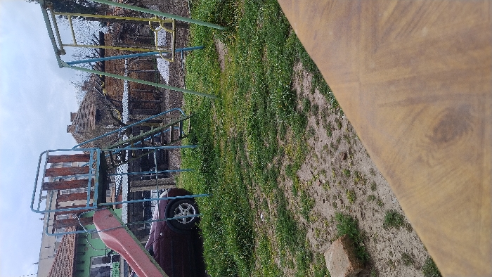 The scene depicts an outdoor playground area in Lom, Bulgaria, under an overcast sky. In the immediate foreground, the lower right quadrant is occupied by a light brown wooden surface, possibly a tabletop or bench, exhibiting distinct wood grain patterns. The midground features an unkempt grassy and dirt-covered ground. Dominating this area are two pieces of playground equipment: 1. To the left, a blue metal-framed structure incorporates a pink slide descending from a raised platform with wooden railings. A metal ladder provides access to this platform. 2. To the right, a light green metal-framed swing set stands with two yellow swings. A dark red or maroon vehicle, appearing to be a compact SUV or hatchback, is parked on the left side, partially visible behind the slide structure. Its front end and a silver-colored wheel are discernible. A single, light-colored brick rests on the ground in the lower-left corner of the frame. The background consists of various buildings and sparse vegetation. On the far left, a light green building with white-framed windows is visible. Towards the center-right, a brick structure with an exposed and partially damaged or removed roof, showing wooden rafters, is present. Several other buildings with traditional red-tiled roofs are scattered throughout the background. No individuals are present, and no activities or interactions are observed.
