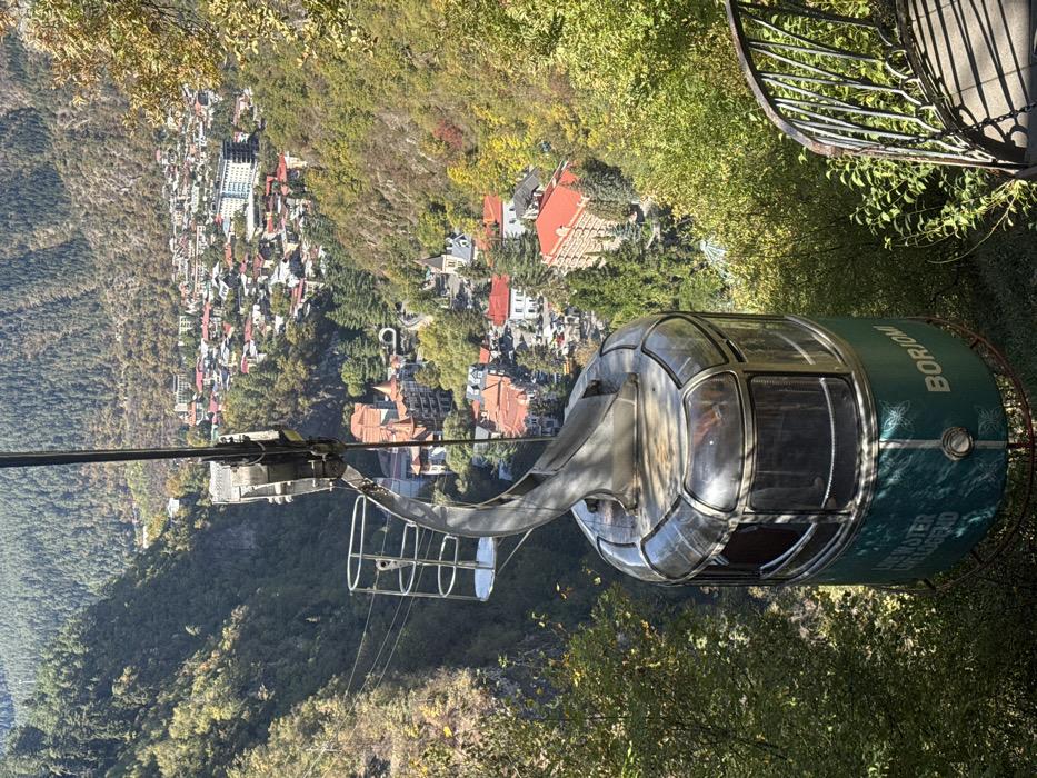 The image depicts a green cable car gondola suspended above a valley, providing an aerial view of the city of Borjomi, Georgia