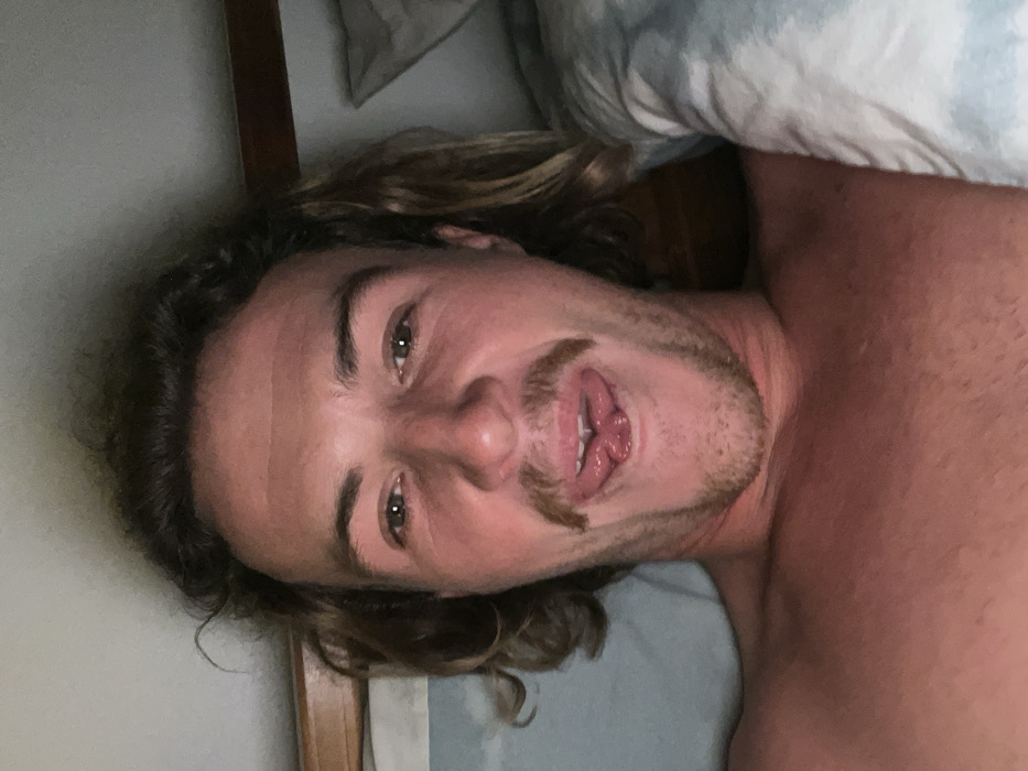 A male individual is depicted in a close-up selfie within what appears to be an indoor, low-light setting, possibly a bedroom, located in Coalcliff, Australia. The subject is an adult with light brown, wavy hair extending to the shoulders and a moustache connected to a chin-strap beard. His eyes are open and directed at the camera. His mouth is open, with the tongue extended and curled into a cloverleaf shape. The individual's shoulders and upper chest are visible, suggesting he is shirtless, and his skin exhibits a tanned complexion. To the left, a light-colored sheet or pillow is present beneath him, alongside a wooden object and a light wall/ceiling. To the right, a pillow with a light blue and white tie-dye pattern is visible beside his head. The overall lighting is dim.