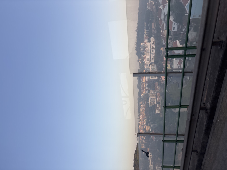 The image displays an elevated view of the city of Oeiras, Portugal, under a clear, light blue sky that transitions to a paler hue near the horizon. In the immediate foreground, a dark grey metal guardrail is visible, partially obscured on the left. Behind this, a green metal railing extends horizontally across the frame. Transparent panels, likely sound barriers, are situated behind the green railing, exhibiting prominent reflections that suggest the photograph was taken from within a vehicle. Below the infrastructure, a residential urban landscape unfolds, characterized by numerous white and light-colored apartment buildings and houses with varied roof colors, interspersed with significant areas of green vegetation and trees. The terrain appears undulating, with buildings constructed on hillsides and in valleys. A dark-colored bird is captured in mid-flight, with its wings spread, positioned on the far left of the frame above the midground cityscape. No people are visible. The overall scene indicates a clear day, with soft, directional light.
