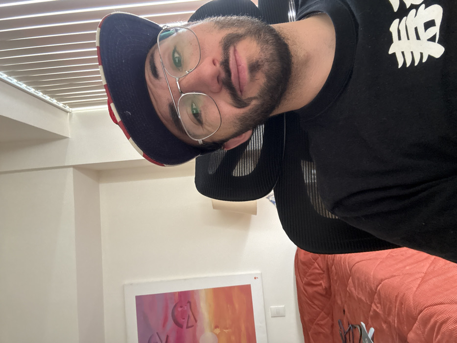 A person wearing a baseball cap and glasses is seated in an office chair. The person is angled slightly towards the viewer with the background including a white wall, a painting, a window with blinds, and a sofa. The person has a short beard. The black long-sleeved shirt the person is wearing has a white Japanese character on the upper right.