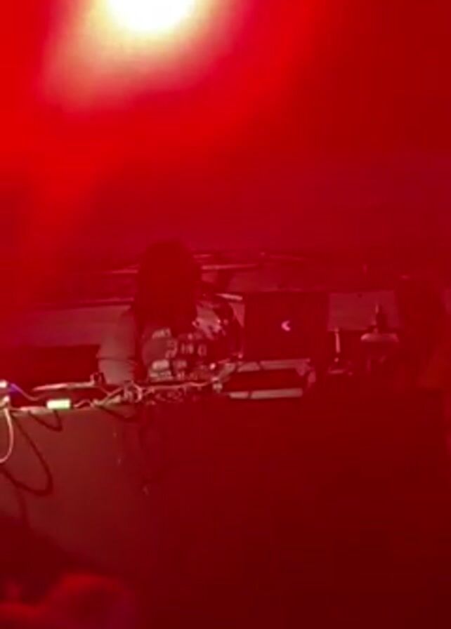 DJ performing at a club. The lighting is primarily red and purple. Several people are in the foreground. A DJ is behind a DJ console, with security standing to the right.