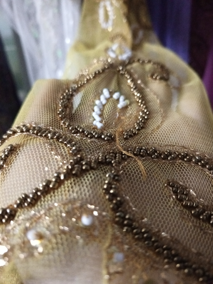 This image captures a close-up view of intricately beaded fabric, observed within the city of Phakeo, Laos. The primary subject is a piece of light gold, semi-translucent, fine-mesh fabric, possibly tulle or organza, serving as a base for elaborate hand-applied beadwork. Darker gold or bronze-toned spherical seed beads are meticulously arranged in complex, curvilinear patterns across the fabric, forming interconnected loops and abstract designs. Interspersed within these patterns are clusters of small, opaque white, elongated beads, forming distinct elements such as crescent shapes. The beadwork creates a three-dimensional texture on the fabric surface. A single, light brown thread, possibly a loose fiber or part of the bead attachment, is visible near the center-right of the frame, slightly disrupting the pattern. The background is significantly out of focus, indicating a shallow depth of field. Blurred shapes and colors suggest other fabrics or soft materials, with lighter tones to the upper left and darker, purplish hues to the upper right. No individuals are present in the frame. The scene implies a focus on textile detail, possibly in a workshop or retail setting.