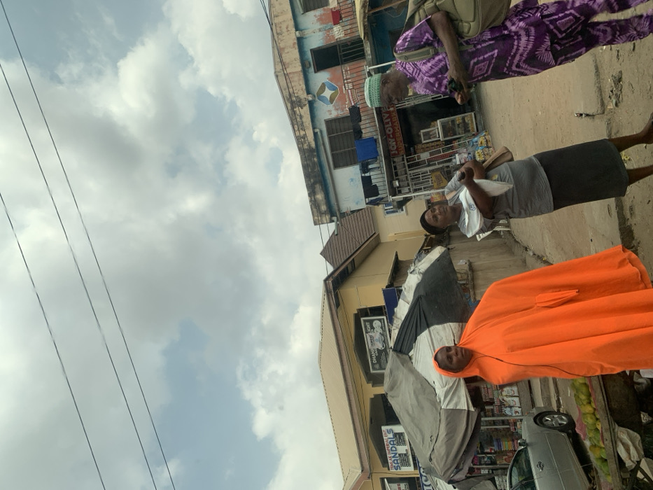 This image displays an outdoor street scene in Lokoja, Nigeria, under a sky with scattered clouds and visible overhead power lines