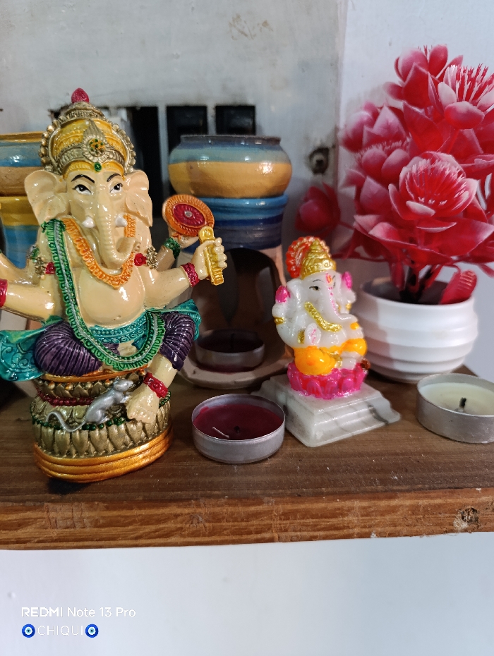Two Ganesha statues sit on a wooden shelf. The larger one is adorned with gold and green jewelry, holding a decorative object. A small mouse figure is at its base. A smaller, white Ganesha sits beside it. Two tea light candles are placed nearby, one with red wax, the other with white wax. Behind them is a stack of ceramic pots and a white flower pot with red artificial flowers. A white wall forms the backdrop.