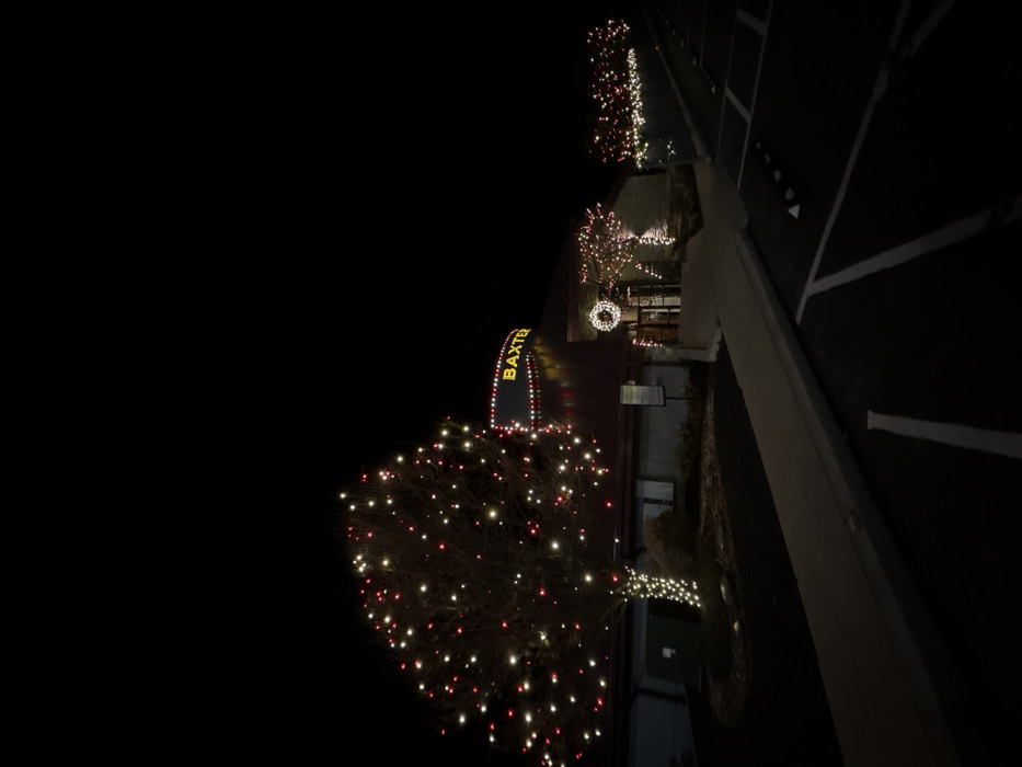 A nighttime view showcases a building decorated for the holidays. "BAXTER" is vertically displayed in illuminated letters on the building's facade. A large tree adorned with red and white lights stands prominently in front. Further back, another tree with white lights and a wreath are visible. A parking lot with painted lines stretches along the building's side, completing the festive scene.