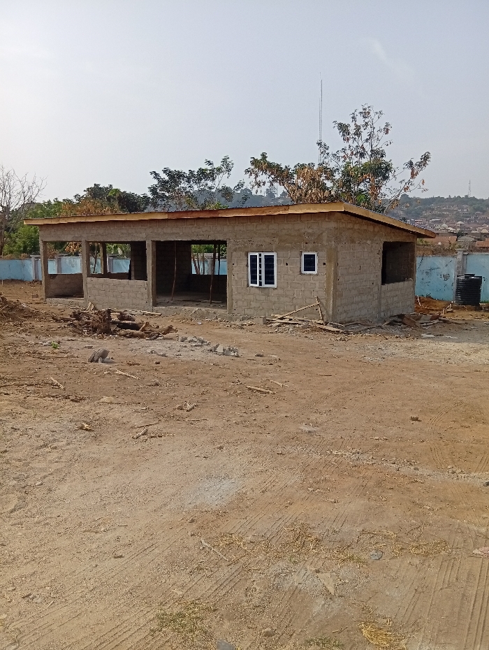 This image displays an uncompleted, single-story building in Okene, Nigeria, viewed from the front-right
