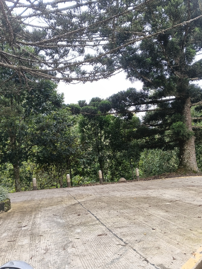 The image displays an outdoor scene in Munyati, Zimbabwe, featuring a concrete pathway flanked by dense vegetation. In the foreground, a light grey concrete surface, textured with numerous parallel grooves, extends from the bottom of the frame towards the midground. A dark, indistinct object is partially visible at the bottom left edge. Along the far side of the paved surface, three off-white, cylindrical bollards with darker, discolored tops are positioned, separating the pathway from a lower elevation dense with green foliage. The midground and background are dominated by a thick canopy of trees. A large tree with a robust, textured trunk and prominent horizontal branches, some exhibiting light-colored growth, occupies the right side of the frame, its dark green foliage extending into the upper portion. To the left and center, a continuous expanse of diverse green trees forms a dense forest, receding into the distance. The sky above, partially visible through and above the tree canopy, appears bright and overcast. No individuals, animals, or overt actions are present in the scene.