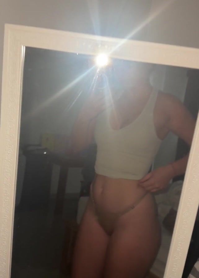 A woman in a beige tank top and thong underwear is standing in front of a full-length mirror, holding her phone up to take a picture