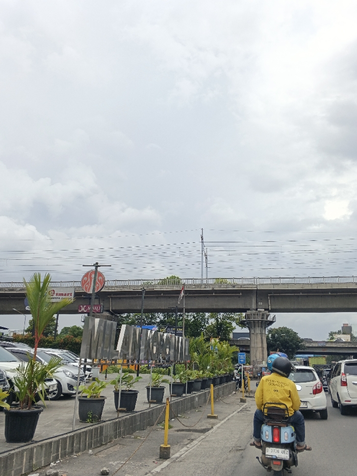 An eye-level outdoor shot depicts a street scene on a cloudy day. A motorcyclist in a yellow jacket is in the foreground. The street is lined with potted plants and a prominent sign. A bridge structure spans above the street, with visible supports. Cars are parked along the side of the road, and traffic is visible in the background. Overcast skies fill the upper portion of the image.