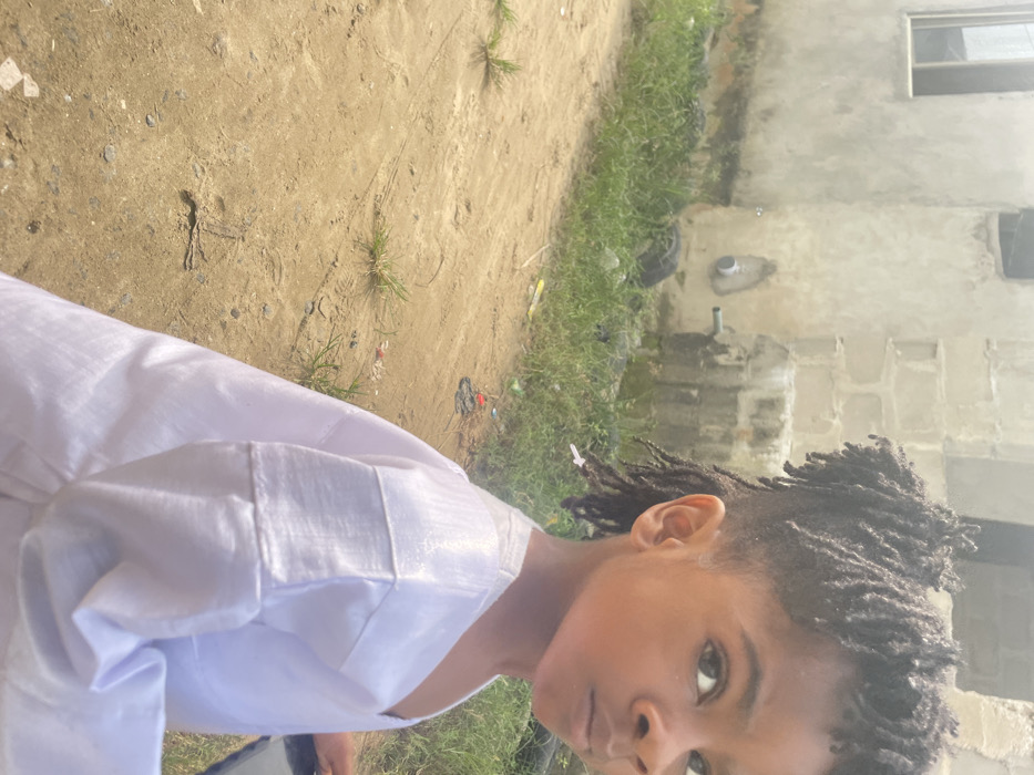 The image depicts a young individual, likely male, with medium-dark skin, looking forward and slightly to the viewer's right. The individual has a distinctive hairstyle featuring black dreadlocks or twists on top and back, with shaved or faded sides. They are wearing a white, V-neck, loose-fitting garment, possibly a traditional tunic, made of a subtly shimmering fabric. The setting is outdoors in Badagry, Nigeria, under bright daylight. The ground is composed of light brown, dry dirt or sand with scattered patches of green grass and minor debris. In the background, an unfinished or unpainted concrete block building is visible. This building features a rectangular window opening on its left side and a pipe fixture with a white PVC connection on its right side. The base of the building is bordered by unkempt green weeds and grass, interspersed with debris, including a dark, possibly rubber object like a tire section.