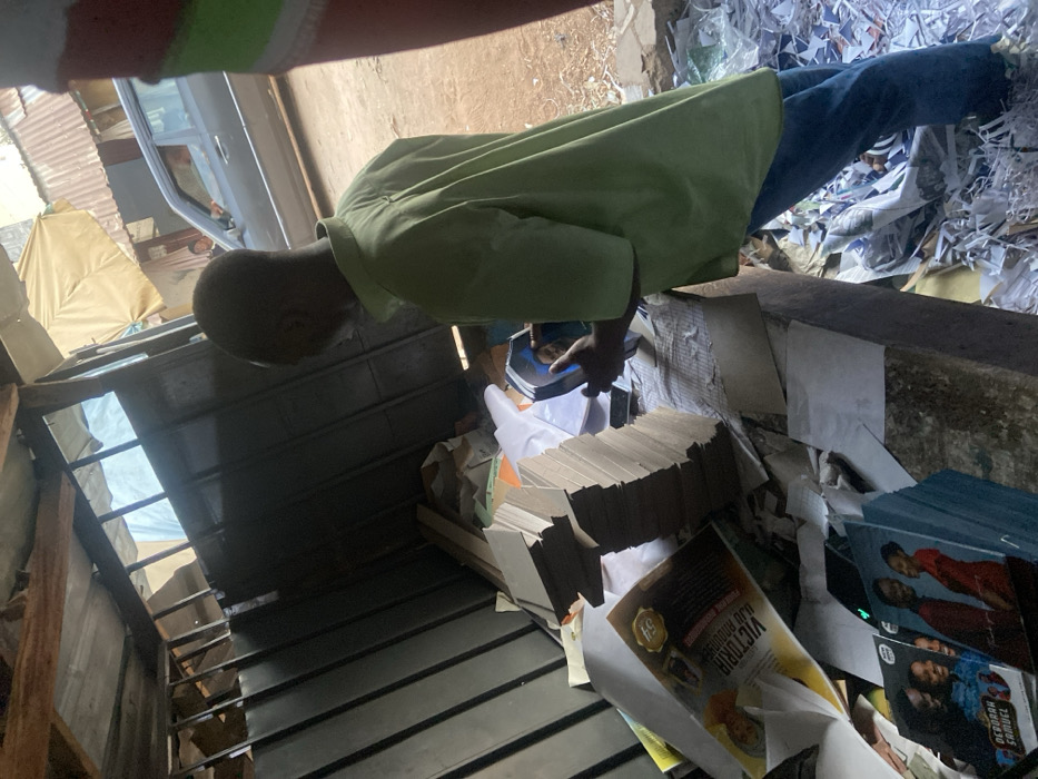 A person in a green shirt and blue jeans stands near a pile of paper and books. Some of the paper appears to be shredded. Several books with faces are visible. The area looks cluttered and possibly dirty. A car is partially visible outside. The photo is taken from an elevated angle, partially obscuring the scene.