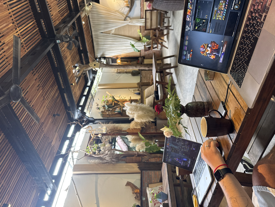 Two laptops sit on a rustic wooden table next to a dark mug and a floral arrangement. One laptop displays a gaming interface. A person wearing a smartwatch rests their hand on a mouse beside the second laptop. The background shows an eclectic interior with exposed wooden beams, ceiling fans, sheer white curtains, and various decorative displays, including plants and rustic furniture.