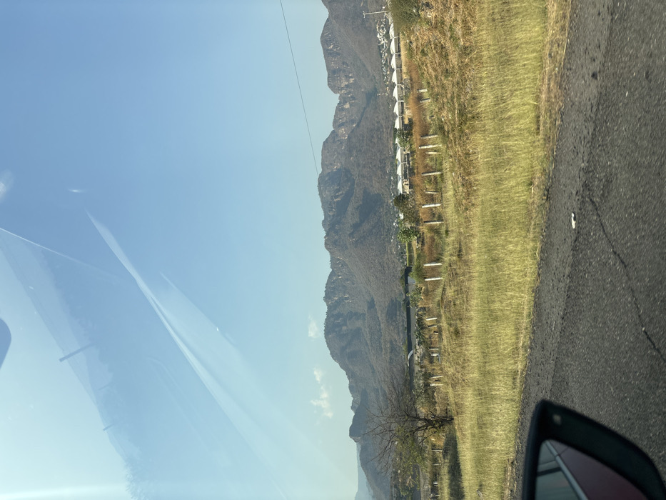 This image captures a wide-angle landscape view in Oacalco, Mexico, taken from inside a vehicle. The foreground features a dark asphalt road surface on the right, exhibiting minor cracks. On the lower left, the black frame and a portion of the red body of a vehicle's side mirror are visible. The midground consists of an expansive field predominantly covered in dry, straw-colored grass with scattered greener vegetation. A series of approximately ten light-colored, vertical posts, likely forming a fence line, extends horizontally across the field. To the left, a single leafless, deciduous tree stands. Beyond the field, a small cluster of buildings is discernible, including a dark-roofed structure and a prominent row of about ten light-colored, possibly residential or resort-style, structures characterized by rounded or conical roofs. The background is dominated by a substantial range of rugged mountains, appearing arid and covered with sparse, dark vegetation, stretching across the horizon. The sky above is clear and bright blue, with a few faint white clouds present towards the left. Reflections from a vehicle's windshield are visible across the upper portion of the image. No individuals or explicit human actions are depicted within the scene.