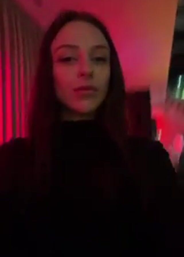 A woman in a black turtleneck looks at the camera, lit by red lighting. Initially expressionless, she later smiles slightly. The environment appears to be a nightclub or bar with blurred lights and other people in the background. The camera's viewpoint changes slightly as if the person holding it is moving. The overall impression is that she is in a social setting with a lively atmosphere.