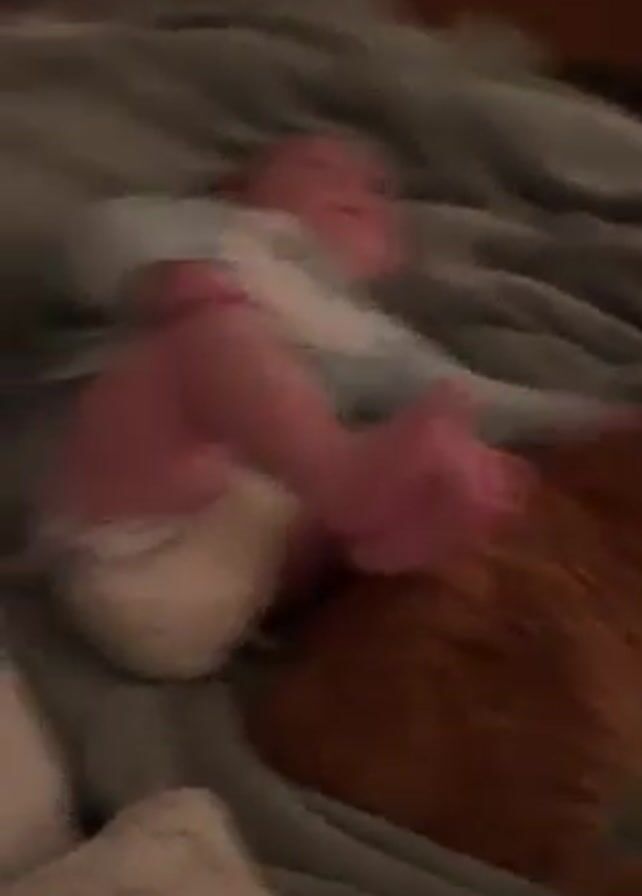 A baby is lying on their back on a grey blanket, crying. The baby is wearing a light blue onesie and a diaper. An orange cat is lying next to the baby, seemingly being used as a support. The baby's feet are resting on the cat's back.