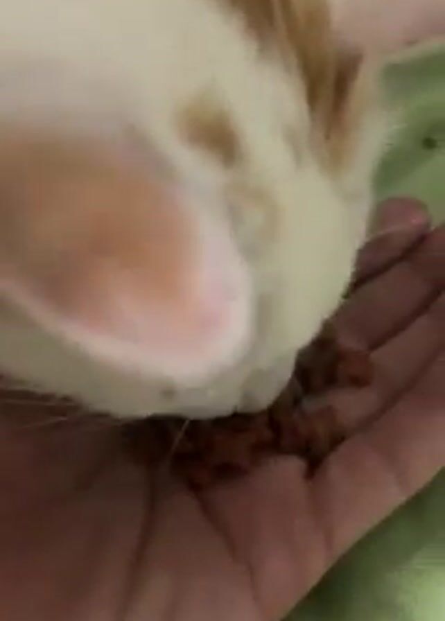 A close-up shot shows a hand holding a pile of brown, presumably dry cat food pellets. An orange-and-white cat approaches the hand and begins to eat the pellets from the palm. The cat's fur is visible as it lowers its head to the hand. The backdrop includes a green surface, likely a bed or blanket.