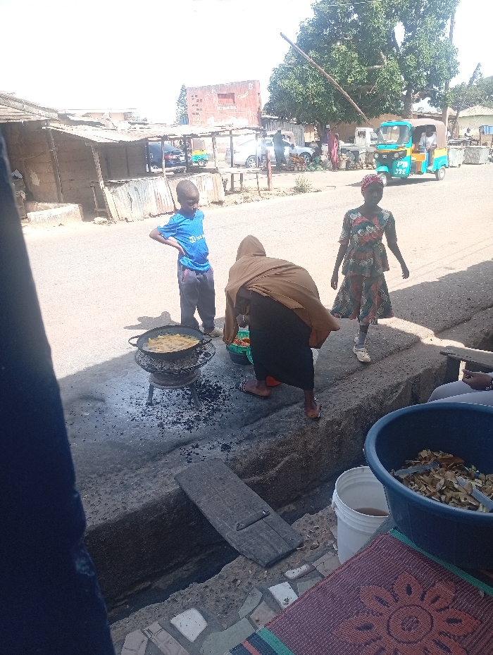 An outdoor street scene depicts food preparation activities on a paved road shoulder in an unspecified urban or semi-urban environment during daylight
