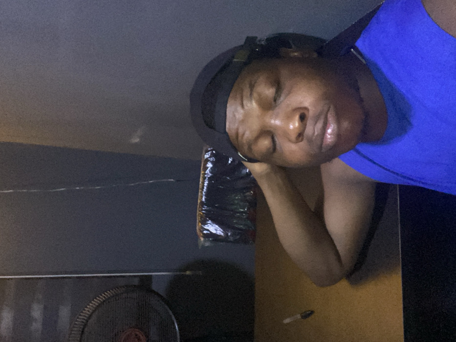 A male subject with dark complexion is depicted in a dimly lit indoor environment identified as Alor, Nigeria. He is positioned in the foreground, facing forward with eyes closed, wearing a black baseball cap reversed and a blue sleeveless top. Black headphones are visible beneath the cap. His right forearm is bent and rests on an unseen surface, with the hand obscured. To the left of the subject, a light brown horizontal surface, likely a desk, holds a black pen. Behind the subject's left side, on the same brown surface, a rectangular package of dark material enclosed in clear plastic is present. In the upper left background, a dark circular fan is mounted or situated against a dark grey wall. Thin, light-colored wires are vertically affixed to the wall in the upper left quadrant. The background consists of plain dark grey walls.