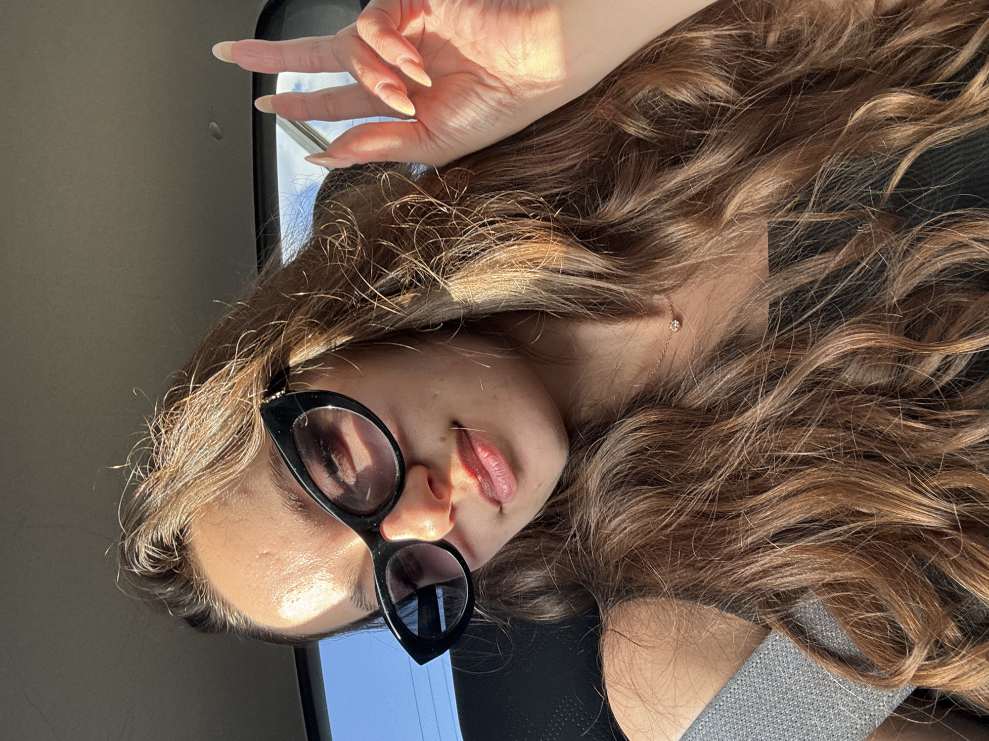 A woman with long, wavy brown hair and wearing black sunglasses is indoors, likely in a vehicle