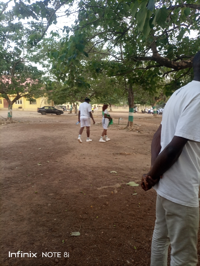 A sunlit outdoor scene features a dirt ground area with sparse vegetation and scattered leaves. Several trees with green and white striped trunks line the perimeter. A building is visible in the distance, with a black car parked nearby. Three individuals wearing white attire are present. Two are walking away from the camera, and a third stands in the foreground, partially obscured, also in white clothes. The scene is overshadowed by tree foliage.