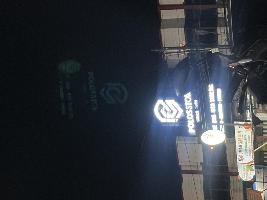 The image depicts a nighttime street-level scene in Lhokseumawe, Indonesia, characterized by prominent commercial signage. The dominant feature is a building with a large, brightly illuminated sign displaying a hexagonal logo containing a stylized letter "S" or "G", followed by the text "POLOSSTON" and "SINCE 2021". Above this main sign, a fainter, inverted, and mirrored projection or reflection of the "POLOSSTON" logo and text is visible against the dark sky. Below the main sign, additional illuminated signs are visible, including a round sign on the left and a banner on the lower left for "RUMAH SABLON" (Screen Printing House) with "SOLUSI UNTUK ANDA" (Solution for You) and "Lhokseumawe" visible on it. The foreground features the handlebars, rearview mirror, and a portion of the front fairing of a dark-colored motorcycle, suggesting the image was captured from or near a parked vehicle. A utility pole with multiple overhead wires stands on the right, partially obscuring the building structure. No individuals or active interactions are visible in the scene.