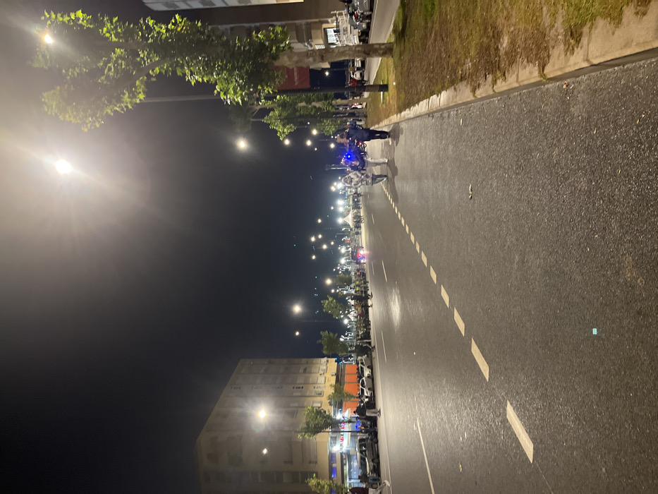 A night scene captures a wide, empty road with dashed white lines extending into the distance, illuminated by streetlights. A building is visible to the left. People and parked cars line the road's edge. Trees are interspersed along the sidewalk. The light from the streetlights causes glare on the asphalt. The sky is dark with only a few blurred lights visible.
