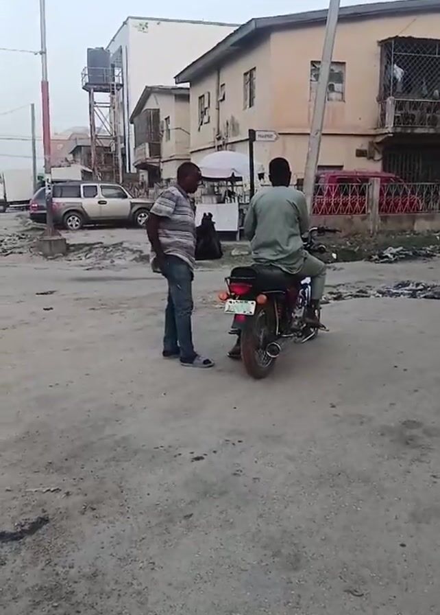 Two men are on a dirt road, interacting. The man on the right sits on a red motorcycle. He is wearing a green long-sleeved shirt and light pants. The man on the left is standing and is wearing a striped shirt, jeans, and blue sandals. He is carrying a black plastic bag. They appear to be talking. The road is unpaved and there is trash visible around the perimeter. There are buildings and parked cars in the background. The sky is overcast.
