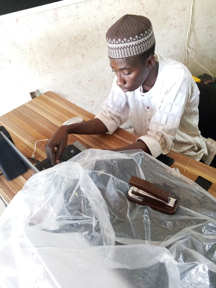 This image, captured in Fagge A, Nigeria, depicts a young individual seated at a wooden desk, focused on a laptop
