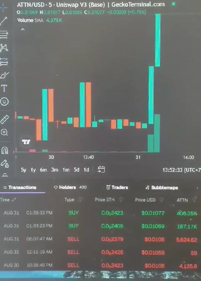 - "computer screen displaying a cryptocurrency chart for ATTN/USD on Uniswap V3 using GeckoTerminal" by FM-6oDkC2, licensed under CC BY 4.0