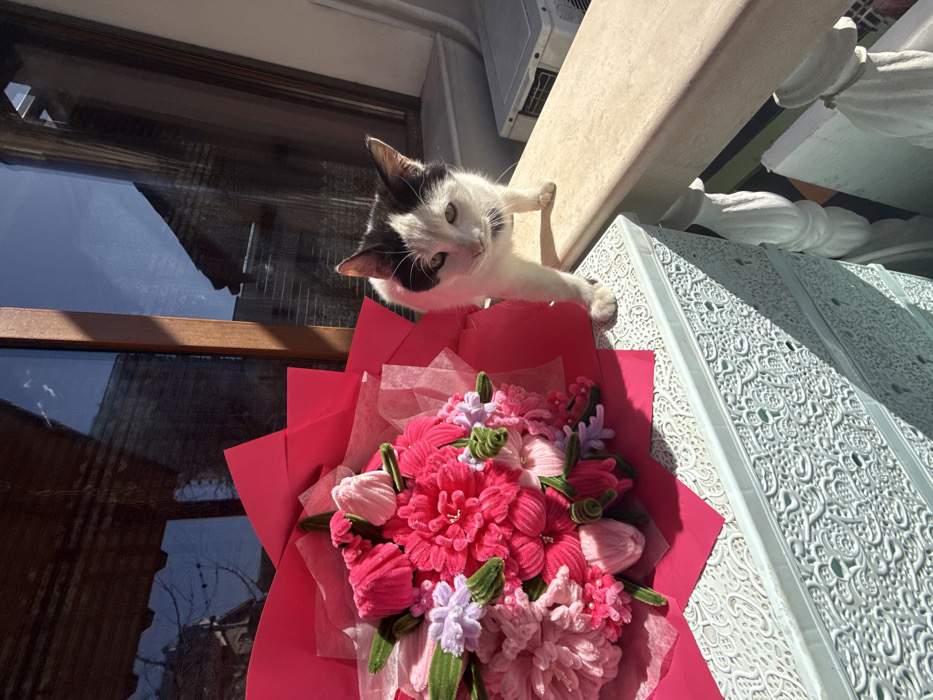 The scene is located in Kyustendil, Bulgaria, likely on a sunlit balcony or patio area. A bouquet of artificial flowers and a black and white domestic cat are the primary subjects. The bouquet, predominantly composed of fuchsia, pink, and light lavender fabric flowers (appearing knitted or crocheted), is wrapped in bright fuchsia paper and translucent pink material. It rests on top of a stack of at least two light blue, rectangular objects, possibly storage boxes or crates, which feature an intricate, raised, lacy decorative pattern. To the right of the bouquet, a black and white short-haired cat with green eyes stands on the surfaces. Its front right paw is positioned on the patterned blue object, while its front left paw rests on a smooth, light beige horizontal ledge or railing. The cat faces forward and wears a dark collar. The background reveals a large window with dark wooden frames, reflecting a clear blue sky, sparse clouds, and the dark silhouettes of a roofline and bare tree branches. The scene is illuminated by bright natural sunlight, creating distinct shadows.