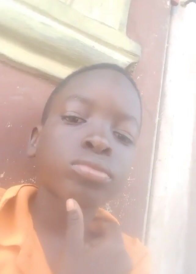 A young boy with brown skin and short hair is taking a selfie. He's wearing an orange collared shirt. His right hand is on his chin, and in one shot he flashes a peace sign. He stands against a weathered wall with a window frame visible in the corner. The wall appears to be a mix of reddish-brown and white.
