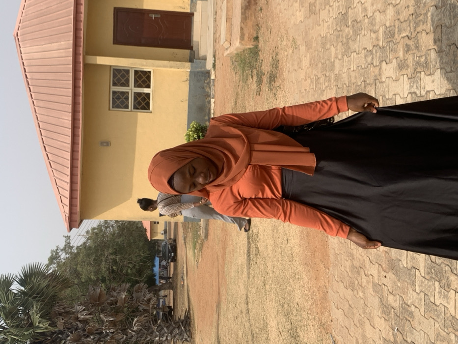 In Oko Erin, Nigeria, a young female stands in the foreground, facing slightly left with her gaze directed downwards. She is attired in an orange long-sleeved top, an orange hijab covering her head and chest, and a black floor-length skirt; her left hand lightly grasps the skirt. In the middle ground, a second female figure, partially blurred, is observed walking away from the camera, dressed in a light-colored patterned top and light-colored pants. The background features a single-story yellow building with a reddish-orange corrugated metal roof, a brown entrance door on the right, and a gridded window on the left; its lower wall section is painted blue. The ground in the foreground consists of light-colored interlocking pavers, transitioning to reddish-brown earth and a dirt path further back. Various trees, including a prominent palm tree on the left, and multiple dark-colored parked vehicles are visible in the distant background. The scene is illuminated by natural daylight.