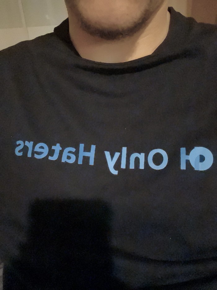 The image depicts a close-up, chest-up view of an individual. The subject exhibits facial hair, specifically stubble or a short beard, on the chin and jawline. They are wearing a dark-colored, crew-neck garment, likely a t-shirt. Emblazoned across the chest, rendered in a light blue hue, is reversed text that reads "ЯО YlnO H SɹƎtⱯH". When unreversed, this text approximately translates to "HATERS ONLY OK". The background consists of an undifferentiated light-toned surface, indicative of an indoor environment. No further specific objects, actions, or interactions are observable. The image lacks any visual cues to ascertain a specific location within Sofia, Bulgaria, or any other geographic area.