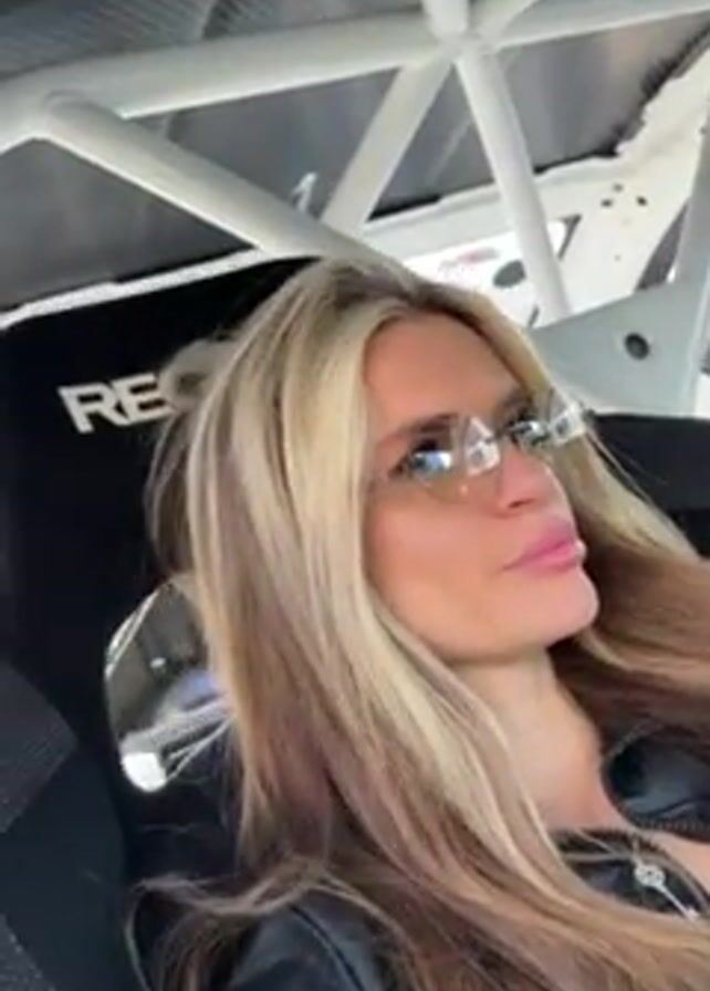 A woman is seated in a Recaro racing seat inside of a vehicle with a white roll cage. She has long blond hair, is wearing tinted sunglasses and a black leather jacket, and is puckering her lips toward the camera. The car appears to be at a racetrack or automotive event, given the sounds of engines and the overall setting. The video is shot from a low angle looking up at the woman.