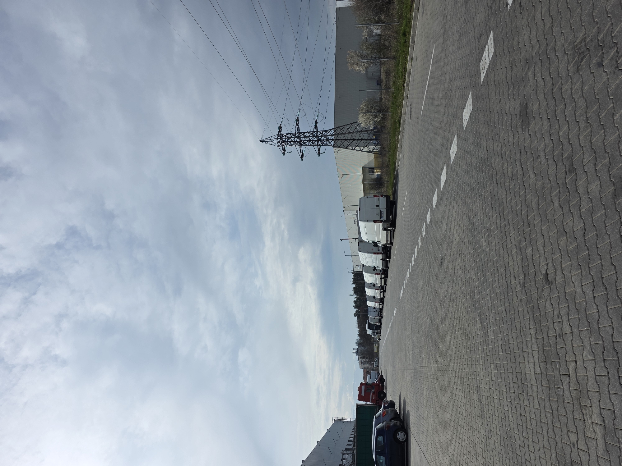 street scene in Gara Elin Pelin, Bulgaria. A row of white vans are parked along the roadside. A few cars of varying colors are parked further down the road. An electrical transmission tower is visible in the background. The road is paved with interlocking concrete pavers. The sky is overcast with white clouds.