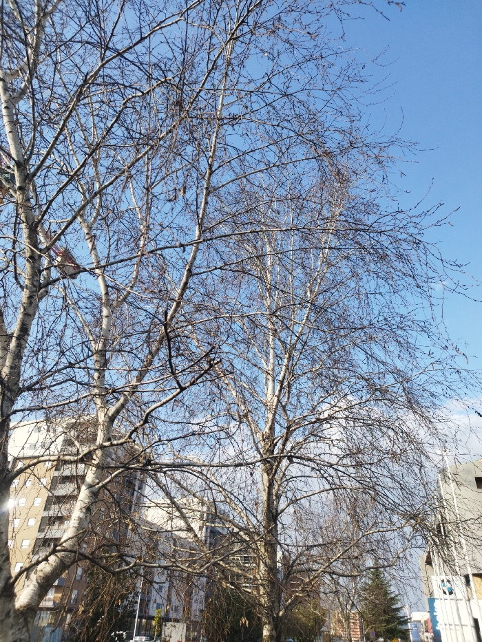 The image depicts an urban street scene in Podgorica, Montenegro, on a clear, bright day, likely during winter or early spring. The upper two-thirds of the frame are dominated by a clear blue sky with minimal cloud cover. Several mature deciduous trees, characterized by pale, possibly birch-like, bark and a dense network of bare, dark-brown branches, occupy the foreground and mid-ground, obscuring parts of the background. A small, irregular red and white object, resembling discarded litter, is lodged within the branches of the leftmost tree. In the background, partially visible through the tree branches, are multi-story urban buildings. On the left, a light-colored building with numerous rectangular windows shows sun glare on its facade. Additional buildings of varying designs and heights are present further to the right. Faint urban infrastructure and darker evergreen vegetation are discernible at ground level. No human figures or discernible actions are present. The scene is illuminated by direct sunlight, casting minimal overt shadows.
