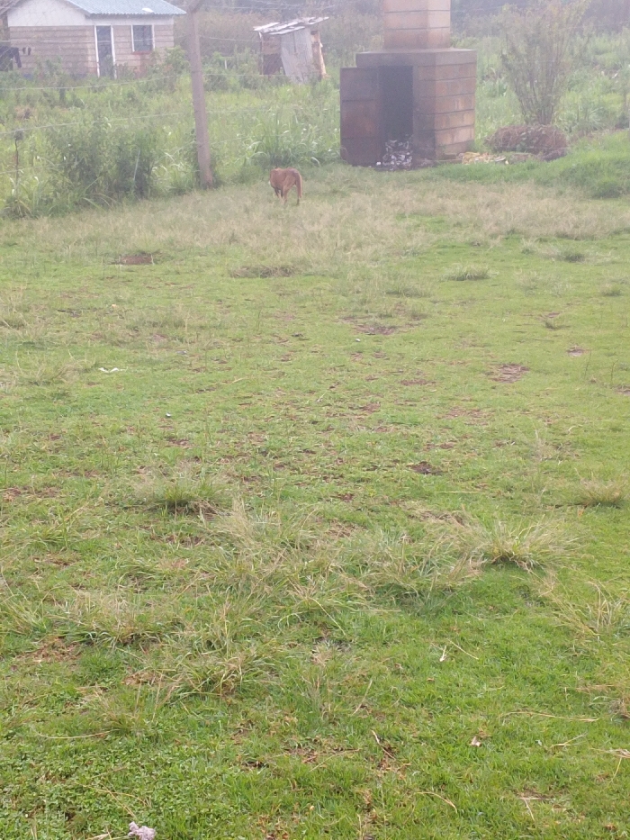 The scene is an outdoor, semi-rural landscape located in the city of Ndeiya, Kenya. The foreground and midground are dominated by a green grassy field with varying patches of growth and visible bare earth. In the midground, a reddish-brown dog is observed from behind, standing or walking, facing away from the camera. To the dog's left, a light-colored wooden fence post is visible, connected by thin wire or string. The background, from left to right, features a small, single-story building with light-colored walls and a light-toned, possibly corrugated, roof. Adjacent to it are dense green bushes and tall grass. Further right, a dilapidated, dark-colored structure, possibly a shed or outhouse with uneven walls, stands. To its immediate right is a square-based, multi-block structure, likely an outdoor incinerator or utility, exhibiting an open side that reveals refuse or burnt debris inside. The far background consists of hazy foliage and an overcast sky, indicating low visibility conditions. No human subjects are present.