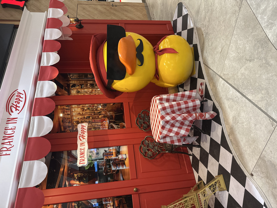 The image depicts an indoor promotional display for a restaurant named "FRANCE IN Happy," likely located within a shopping mall in Sofia, Bulgaria, belonging to the "Happy Bar & Grill" chain. The central subject is a simulated French cafe storefront, characterized by a vibrant red facade with two large glass-paned doors/windows. A red and white scalloped awning extends above, with the "FRANCE IN Happy" logo in red script positioned prominently above the awning and on a smaller, oval sign hanging on the left door. In front of the facade, a small, round, black metal table is covered with a red and white checkered tablecloth. Two dark-colored metal chairs with ornate, possibly floral-patterned, backrests are placed around the table. To the right of this setup stands a large, anthropomorphic yellow duck mascot. This figure wears a red beret, oversized black rectangular sunglasses, an orange mustache, a black handlebar mustache, and a red scarf tied around its neck. A black wall-mounted lantern with an amber-tinted bulb is affixed to the red facade next to the mascot. The display area is floored with a black and white checkerboard pattern, demarcated by a wavy white border from the light grey tiled floor of the surrounding common area. A small, gold-colored, lattice-work model of the Eiffel Tower is visible on the far left of the checkered floor. Through the facade's glass, the restaurant's interior shows tables, chairs, and shelving units stocked with numerous bottles. The scene is static, devoid of human activity.