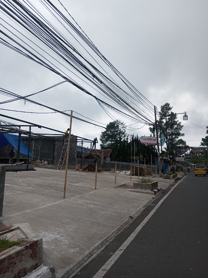 A construction site is visible with workers atop a metal frame structure. A ladder leans against a support beam. The site has a concrete base marked with poles. Overhead, many electrical wires traverse the sky. A road runs adjacent to the construction, where a yellow vehicle drives by. Street signs and trees line the roadside. The sky is overcast.