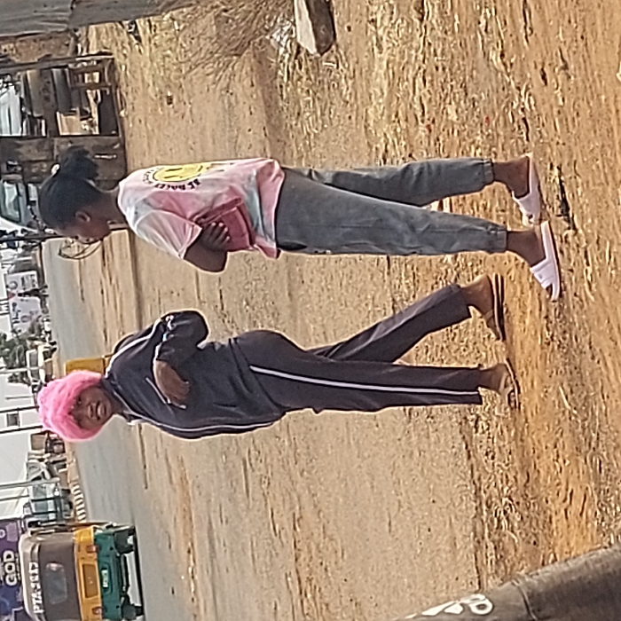 Two young people stand outdoors on a sunny day. The person on top is wearing a pink and white t-shirt and grey pants with white sandals. The person on the bottom is wearing a dark track suit with a pink beanie and brown sandals. They both have their arms crossed. A road with vehicles can be seen in the background. The ground is dusty.