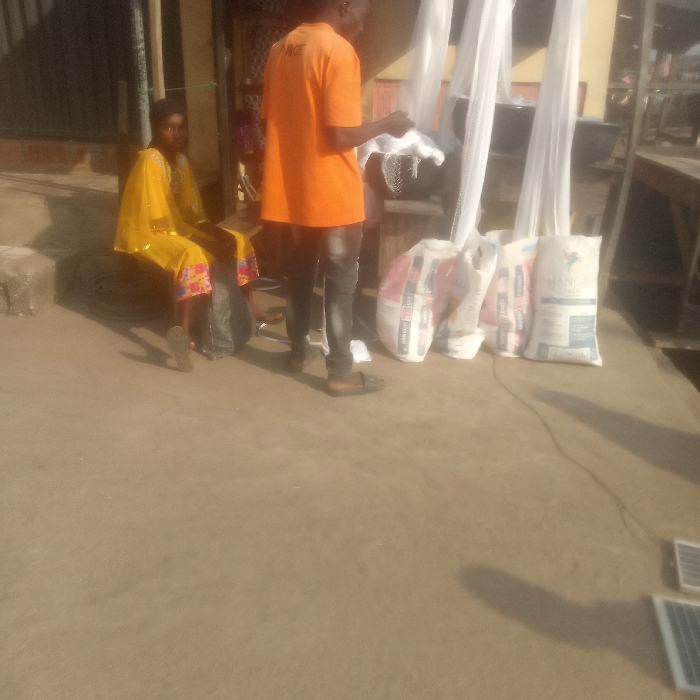 Two people are standing on a paved surface next to several bags of what appears to be cement or construction materials. One person is seated in a yellow garment, while the other stands in an orange t-shirt and dark pants, facing away from the camera. Behind them are what appear to be white tulle drapes. There are solar panels on the ground, adding to the impression that they are on a construction site or outdoor market.