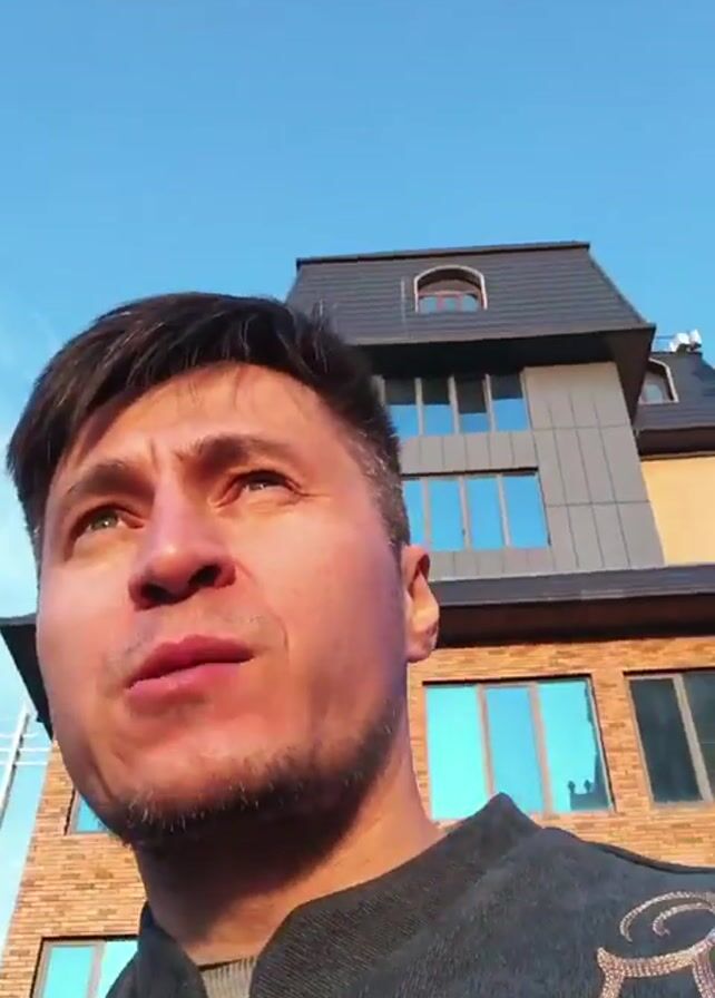 A man with short dark hair and a neatly trimmed goatee is talking directly into the camera. He is wearing a grey jacket with golden embroidery. Behind him, a building with a unique architectural design is visible against a bright blue sky. The building appears to be made of brick and has several windows that reflect the sky. The man is looking up and around as he speaks.