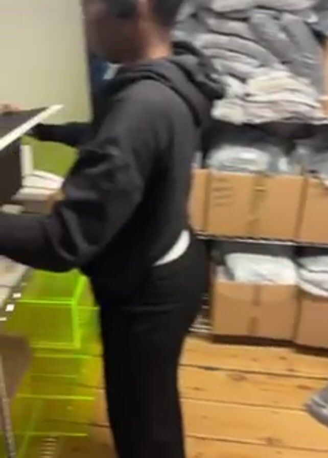 person in a room with boxes and organized storage shelves. The room seems to be a stockroom of some sort, with packaged clothing on the floor and on shelves. The person in the video is a dark-skinned woman with her hair pulled back and wearing black headphones, a black hoodie, and black pants. The woman is standing by a metal wire shelving unit. The shelves hold yellow and green acrylic organizers, notebooks, sticky notes, a laptop, and other various items. She places a large black box on the shelf, opens it, and begins to remove its contents.