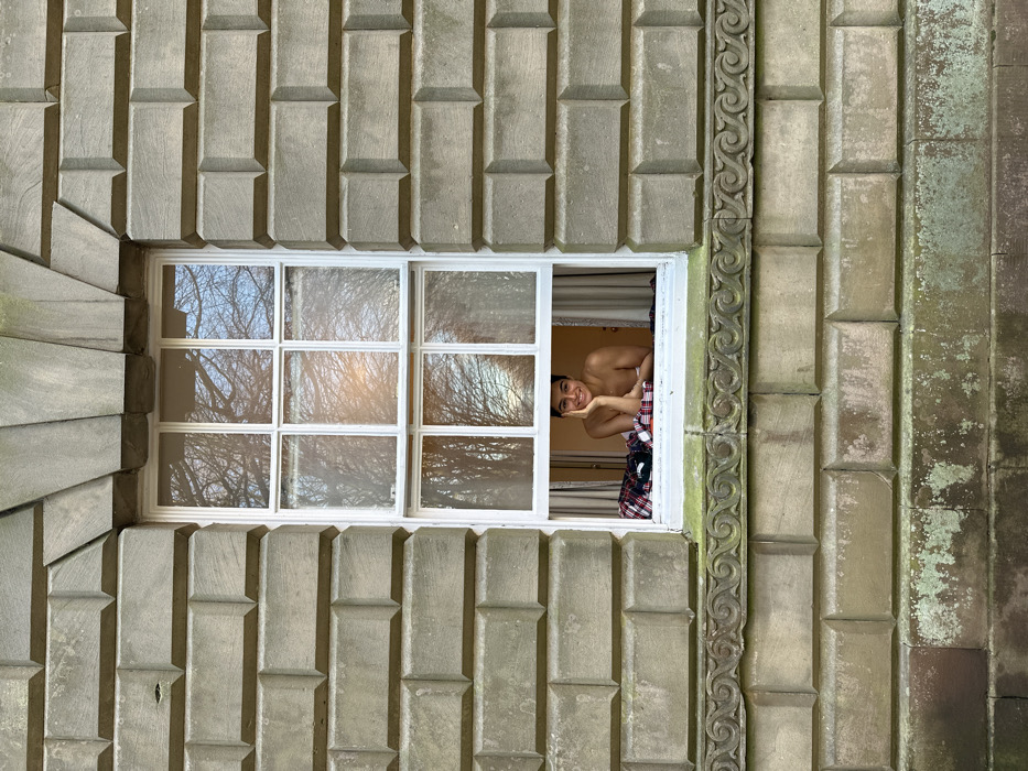 An exterior photograph depicts a person looking out from a window of a stone building in Stafford, United Kingdom. The building facade features light-colored, rusticated ashlar block masonry. A white, multi-paned sash window, with its lower sash open, is centrally framed. Above the window, a classical stone architrave with a keystone-like element is visible, and below the windowsill, a carved stone molding displays a continuous scroll pattern. The lower section of the wall exhibits green discoloration consistent with biological growth. Inside the open window, a smiling individual with dark hair is visible from the upper torso, appearing bare-chested. Their right cheek rests on their right hand, with the elbow positioned on the windowsill. A red and black plaid fabric is draped along the interior windowsill. Light-colored curtains are present on either side of the interior window frame. The upper panes of the window reflect bare tree branches against an overcast sky, indicating the external environment.