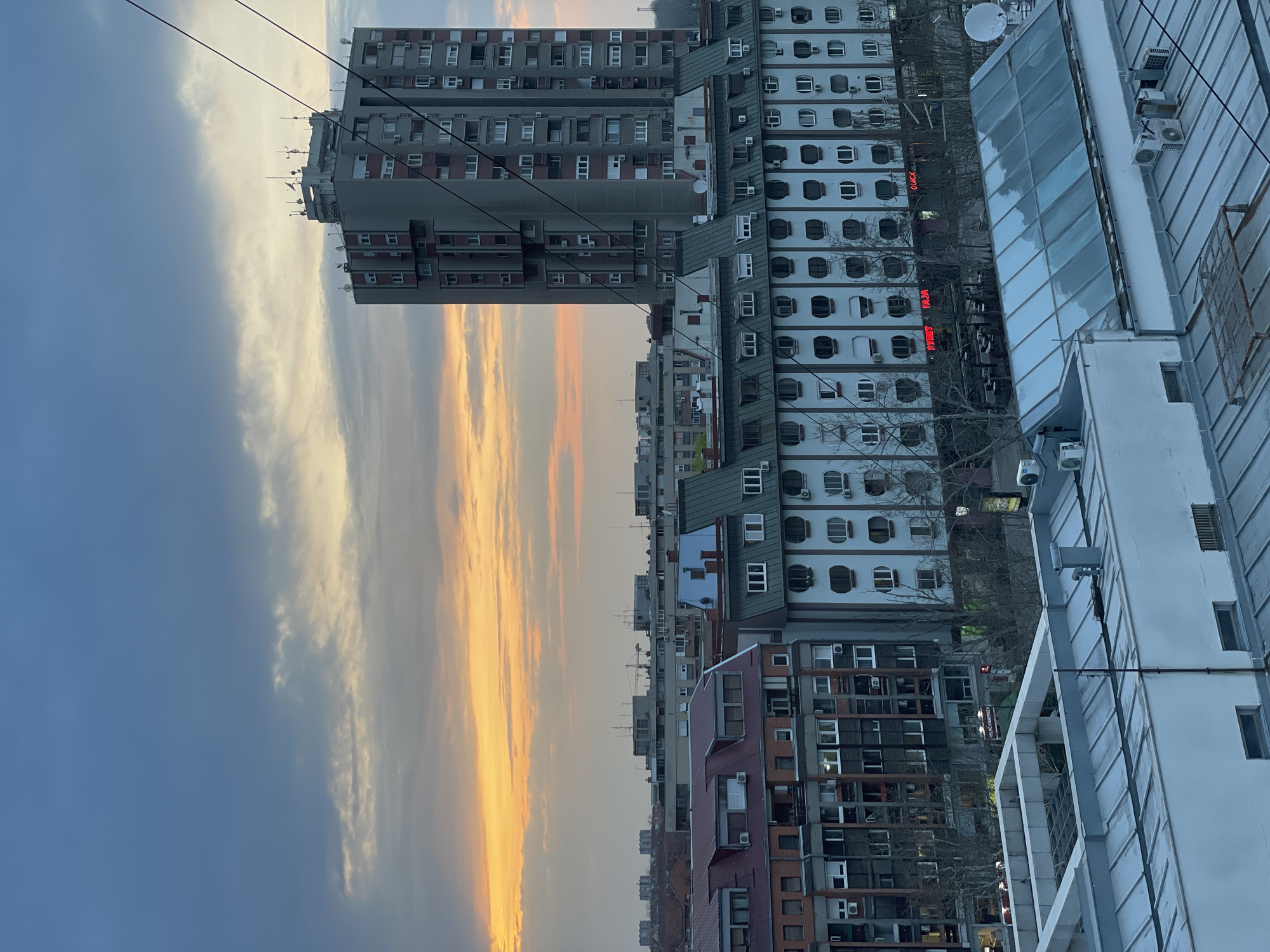 An elevated view captures an urban cityscape in Novi Sad, Serbia, at dusk or dawn. The sky presents a gradient from deep blue-grey at the zenith, transitioning to a striking orange and yellow hue with scattered clouds above the horizon. In the mid-ground, a prominent, tall, grey concrete multi-story residential or commercial tower, characterized by numerous square and rectangular windows, some with exterior air conditioning units, dominates the right side. Its rooftop features multiple antennas and satellite dishes. A diagonal power line crosses the frame in front of this tower. To the left of the tower, a distinctive white, long building features several stories with unique oval-shaped windows arranged in vertical bands. Its dark grey, sloped roof is punctuated by dormer windows. Ground-level storefronts display illuminated red signs, one clearly reading "PRODAVNICA" (shop) and "RADA" or "RADI" below it, and another partially visible as "QUICK". Adjacent to this, to the left, is a red-roofed residential building with multiple balconies and rectangular windows. Further structures of varying heights and designs, mostly residential or mixed-use, extend into the background. The immediate foreground consists of light grey, metallic rooftops, including a large, sloped, translucent or glass-paneled roof section. Several air conditioning units are visible on these rooftops. Bare trees with visible branches are present at street level, interspersed among the buildings. Distant buildings, including the faint silhouette of a construction crane, are visible on the horizon. No individuals are discernible within the frame.