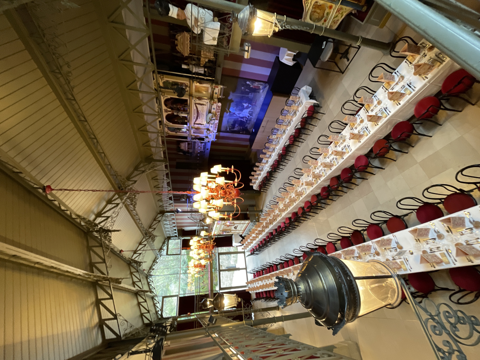 long hall with rows of tables set for a formal meal. Red chairs line both sides of the tables, and each setting includes plates, cutlery, and napkins. Chandeliers hang from the ceiling, and natural light filters through windows along one side. At the far end of the hall, there are displays of what appear to be vintage music machines or automata. The architecture suggests an elegant or historical setting, consistent with a location in Collonges-au-Mont-d'Or, France, known for its upscale restaurants and picturesque surroundings.