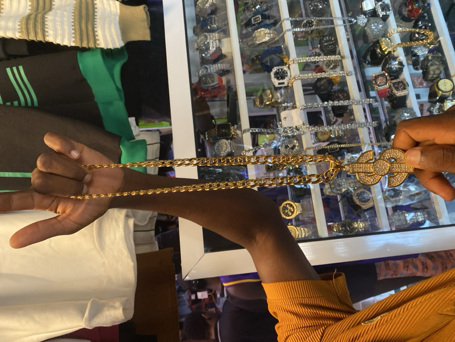 In Lokoja, Nigeria, a close-up, chest-level shot depicts a dark-skinned individual presenting a gold-colored Cuban link chain with a large, pavé-set, crystal-embellished dollar sign pendant
